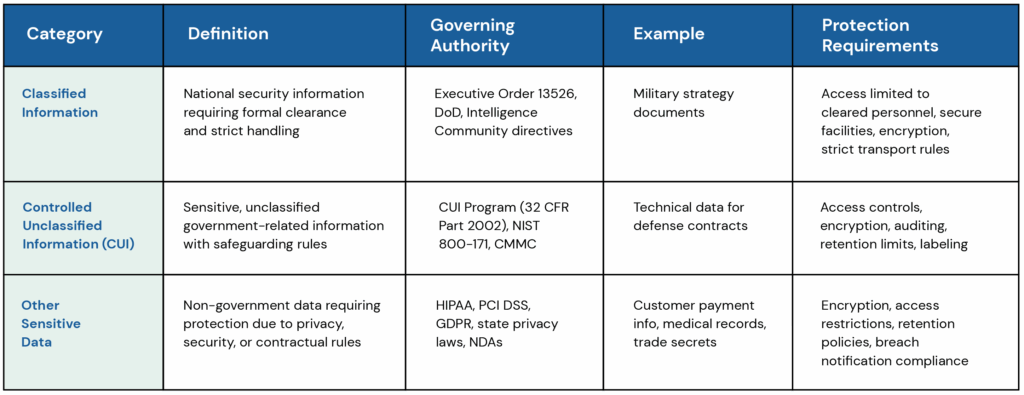 In modern, complex security and compliance environments, not all sensitive information is created equally. Government and defense contractors and suppliers, research institutions, and private enterprises often handle multiple categories of sensitive data, each with its own governance rules, handling requirements, and consequences for mishandling.